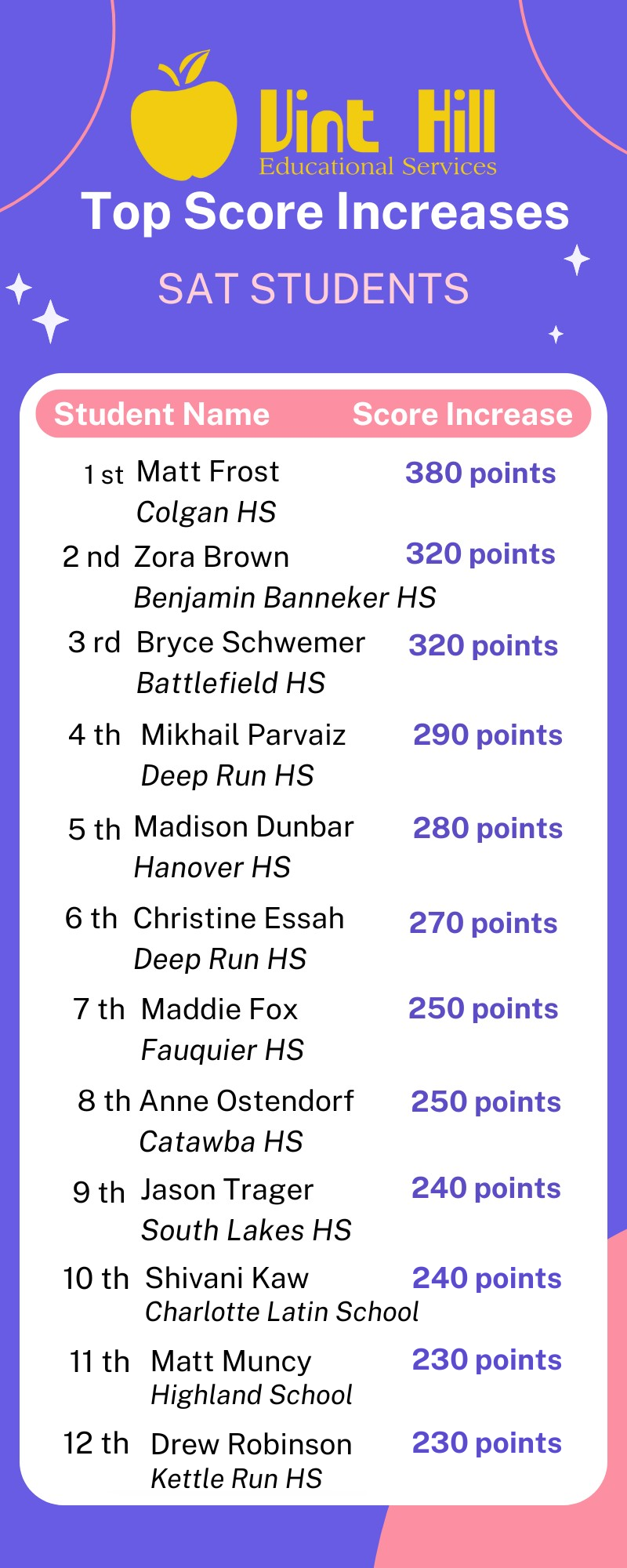 Vint Hill Educational Services offers the following: ACT/SAT/SSAT/ISEE/HSPT test prep tutoring, college counseling, subject-based tutoring, pod tutoring, academic coaching, and mock testing services.